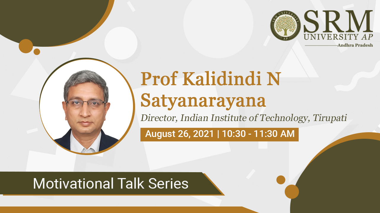 SRM University-AP’s Freshmen Orientation Programme-2021 starts with the first motivational speech of this season with Dr Kalidindi N Satyanarayana as the keynote speaker. Dr Kalidindi N Satyanarayana, Director of IIT Tirupati, Andhra Pradesh, will grace the event with a captivating interactive session with the freshmen-2021. The session has been scheduled for August 26, 2021, at 10.30 am.