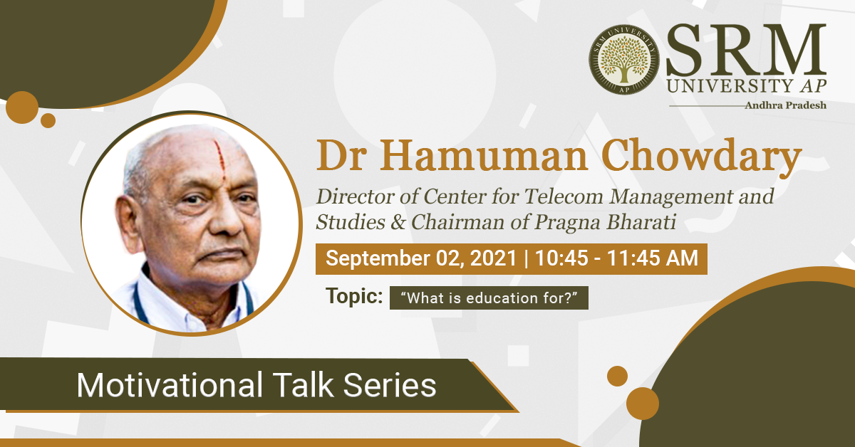 SRM University-AP, Andhra Pradesh, has beseeched Padma Shri awardee Dr T H Chowdary to deliver a motivational speech on “What is education for?” during the Freshmen Orientation Programme designed to welcome the Freshmen 2021 on September 02, 2021, at 10.45 am.