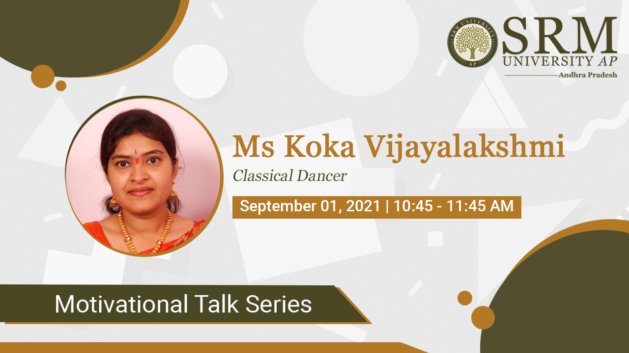 SRM University-AP, Andhra Pradesh, unifies to welcome Freshmen of the academic year by inviting Ms Koka Vijayalakshmi, Classical Dancer, to deliver an inspiring speech on September 04, 2021, at 10.45 am.
