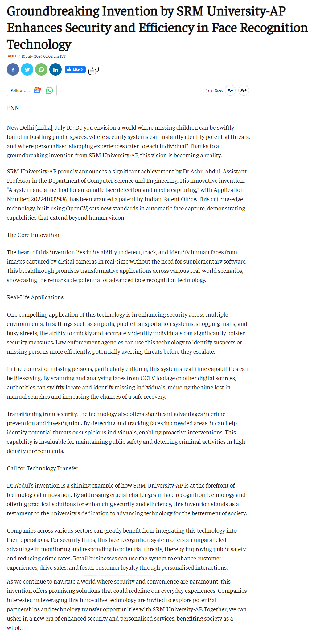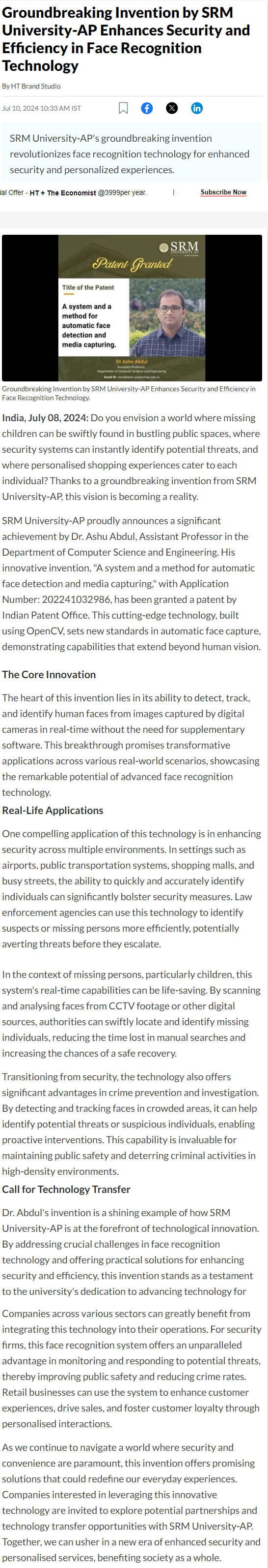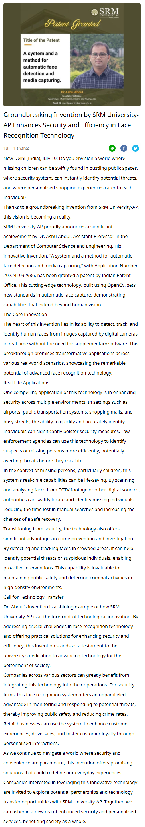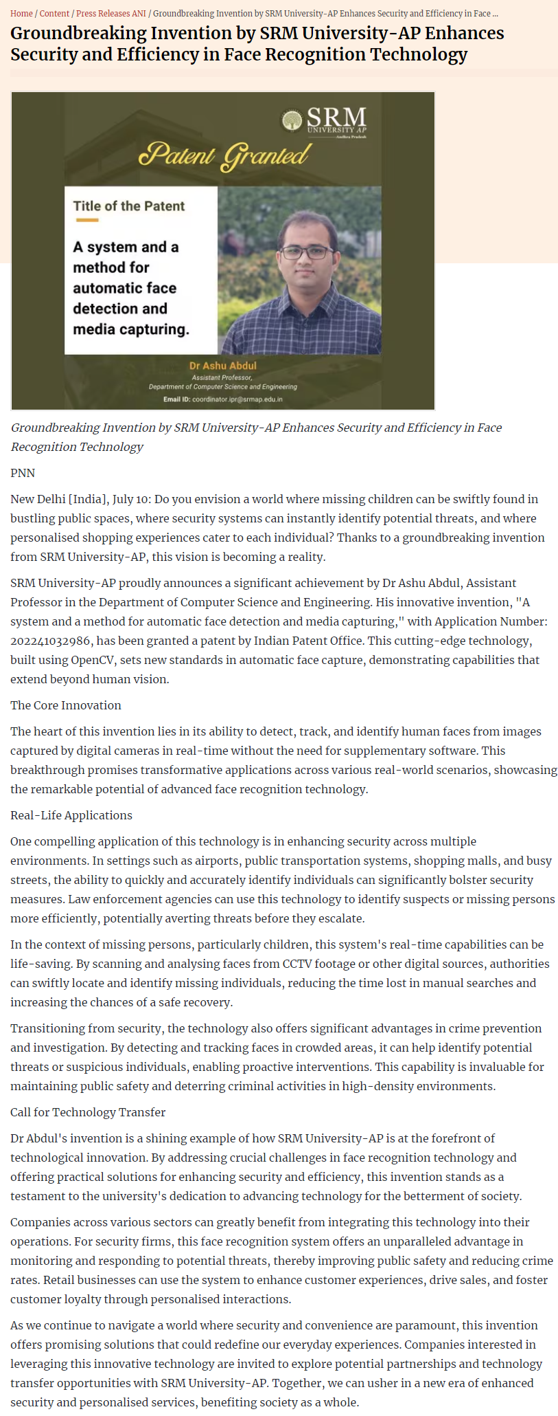 Groundbreaking Invention by SRM University-AP Enhances Security and Efficiency in Face Recognition Technology