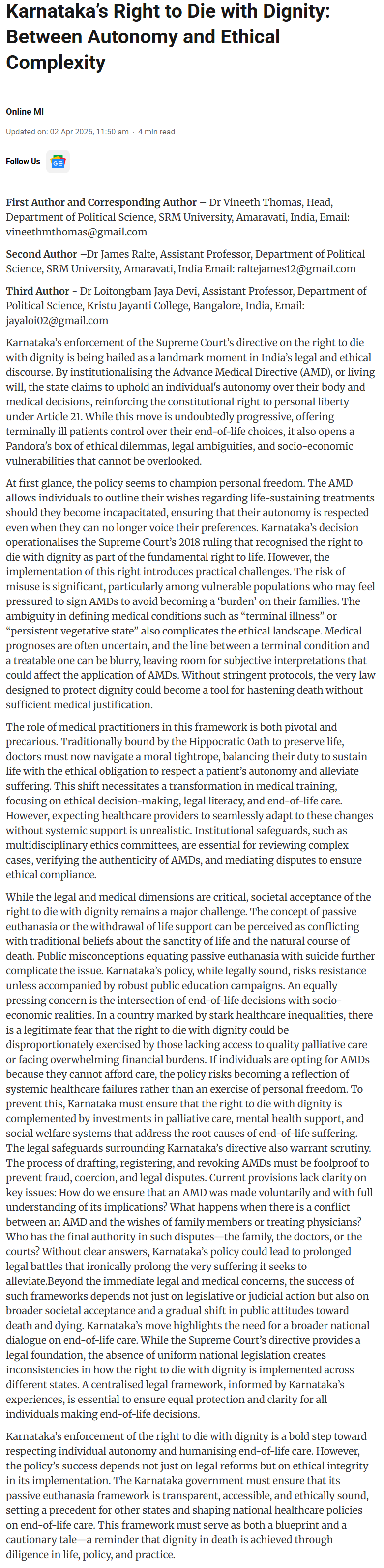 Karnataka’s Right to Die with Dignity: Between Autonomy and Ethical Complexity